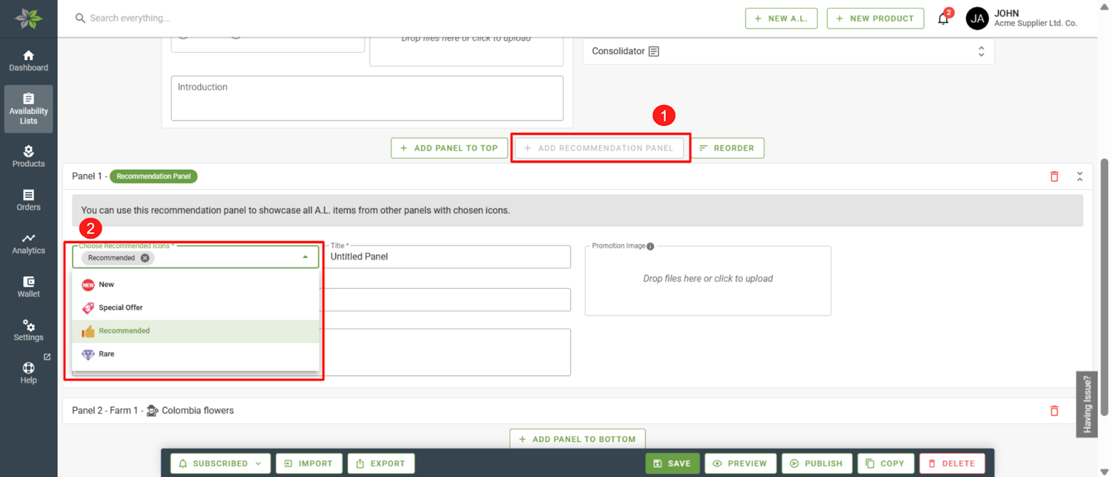c. Add a Recommendation Panel to the top of the A.L.[1], and select which icons[2] you wish to promote in the panel. Products with the relevant icons will appear in both the recommendation panel and the original panel.