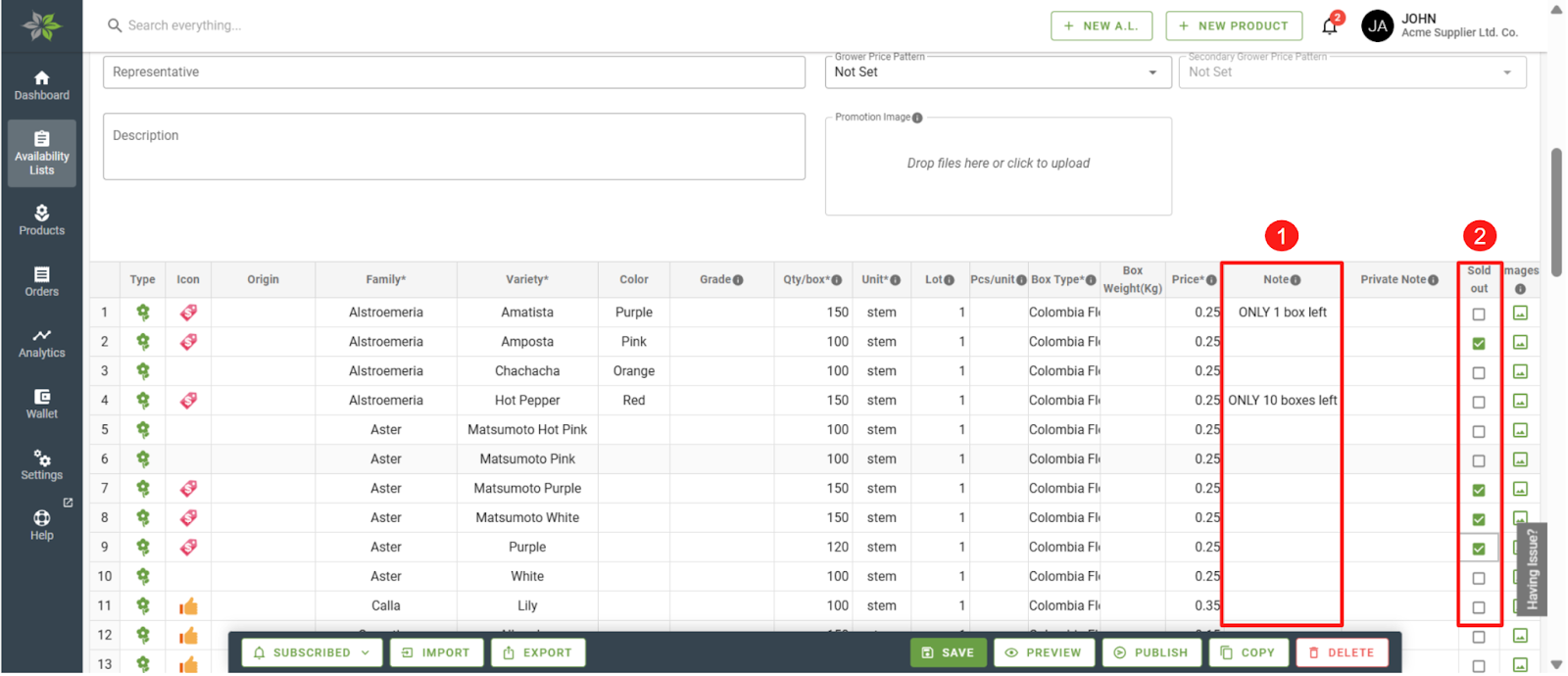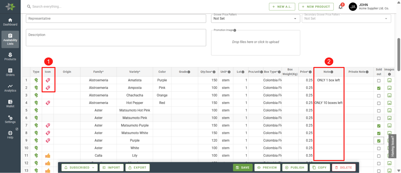 a. Edit the prices of promotional products directly in the relevant A.L. panel. Add a Note[2] or set the Special Offer Icon[1] to highlight the products to your Merchants.