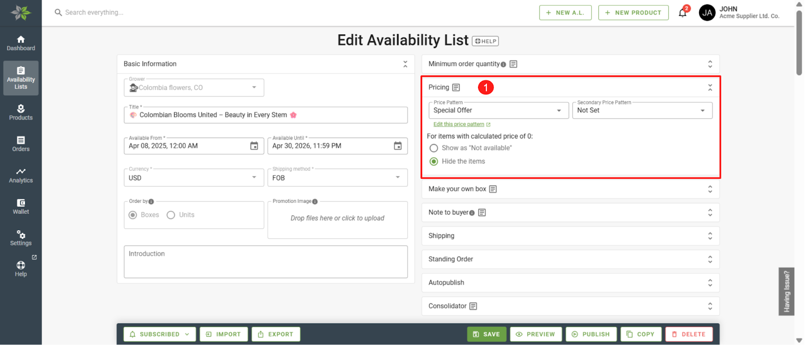 Availability lists are your listings of ready-to-purchase products, including prices and packing units per box for your merchants to choose from. You can select who is able to view and make purchases for the A.L. Prices displayed to merchants can ...