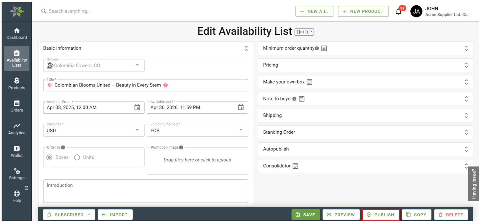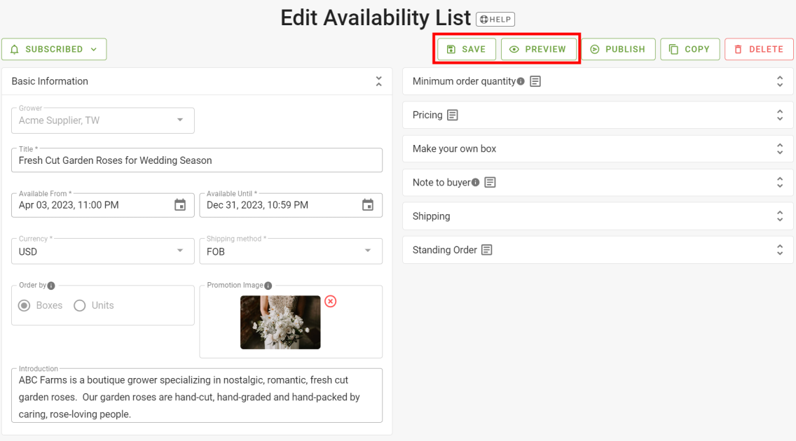 Availability lists can be published under growers and this information will also be displayed to merchants. To do so, select them from the Grower drop-down list under the Basic Information when creating new availability lists. Find out more on how to ...