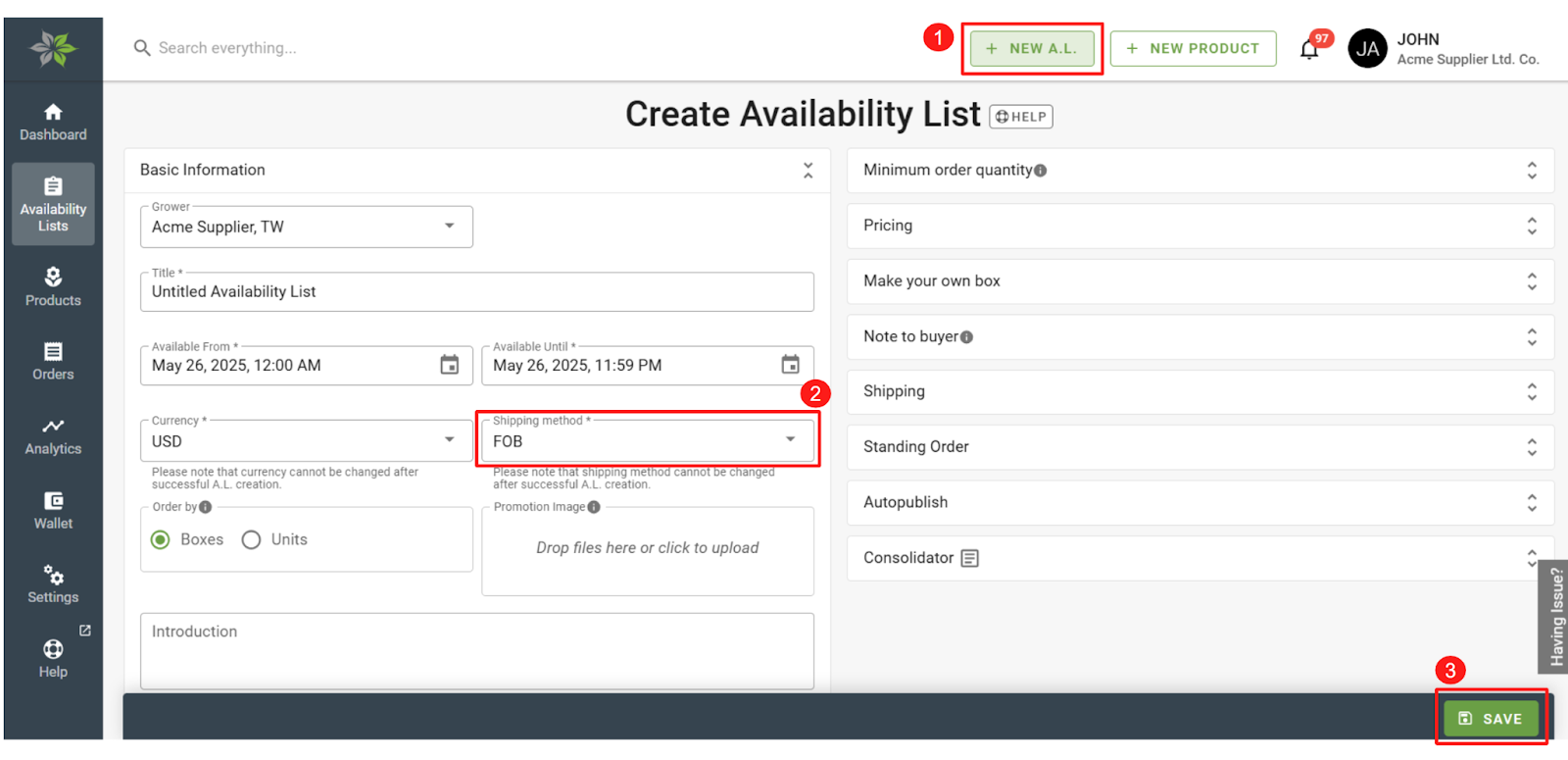 1. To make a new Availability List (A.L.), click on the + New A.L.[1] button and fill in the basic information required.