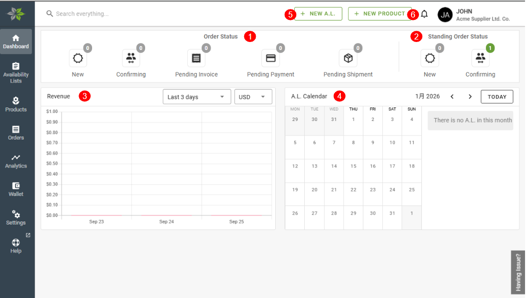 A.L. Calendar[4]: The availability calendar where you will be able to see the availability lists that are open for orders in that calendar month.