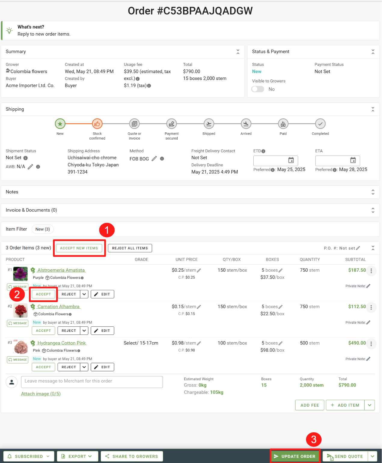 4. For any updates or changes made to the order by the Merchant or FMI Admin, you will receive an email notification to check on the order and respond as required.