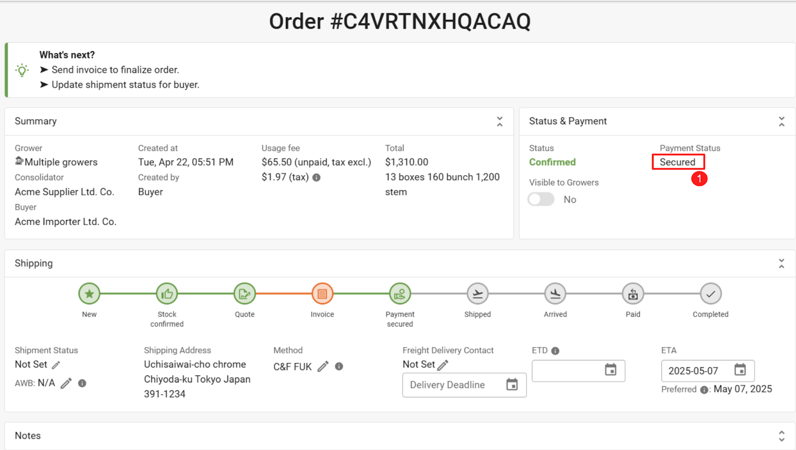 7. Once the Merchant has allocated the required amount to the order, you will receive an email notification informing you that payment status on the order has been updated to Secured[1].This means you can proceed to start preparing the products for shipment.![]()