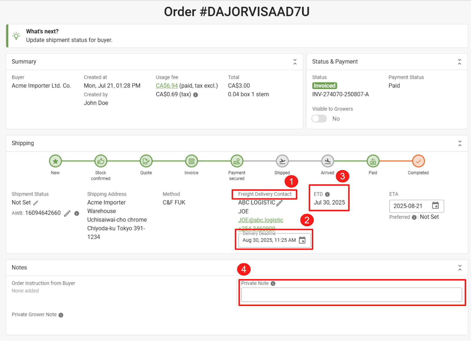 2. You can check the Freight Delivery Contact[1] section (in the Shipping panel) and coordination details and flight information for the order.
