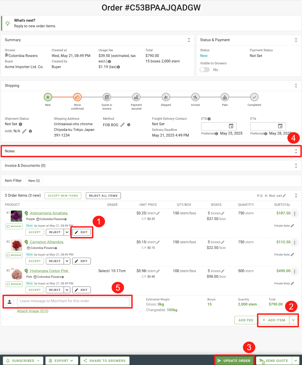 Notes[4]: Check this section for order instructions from the Merchant, and for information from FMI Admin if any